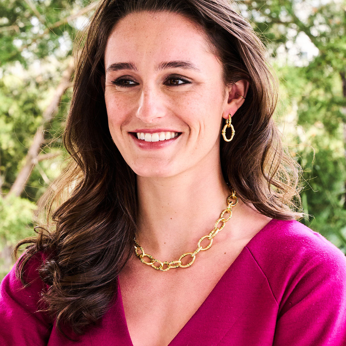 Our wanderlust twist on the classic chain necklace in golden bamboo, with a wink of verdant green enamel accents for a splash of color. This statement necklace and outfit-finisher is perfect for your everyday adventures, whether you’re headed to the office, a dinner party, or jet setting around the globe.